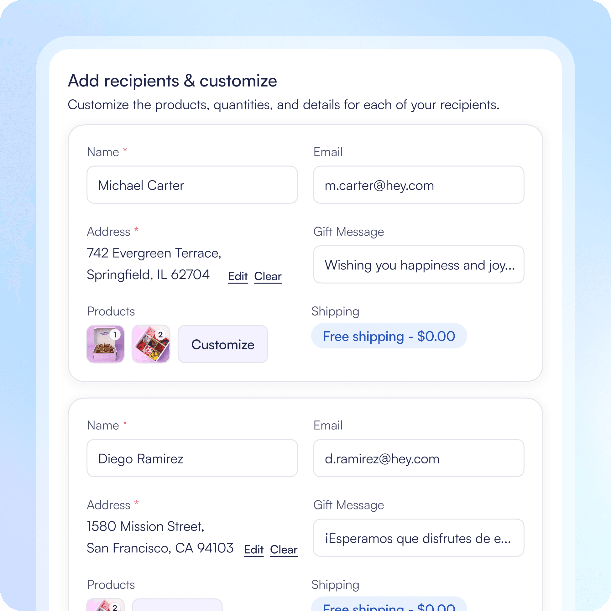 Let your buyers self-serve, and turn your gifting page into a 24/7 revenue channel.Highlight curated collections and let shoppers add recipients and head straight to checkout in just a few clicks.Feature your best-selling gifts, bundles, or seasonal sets in one collection.