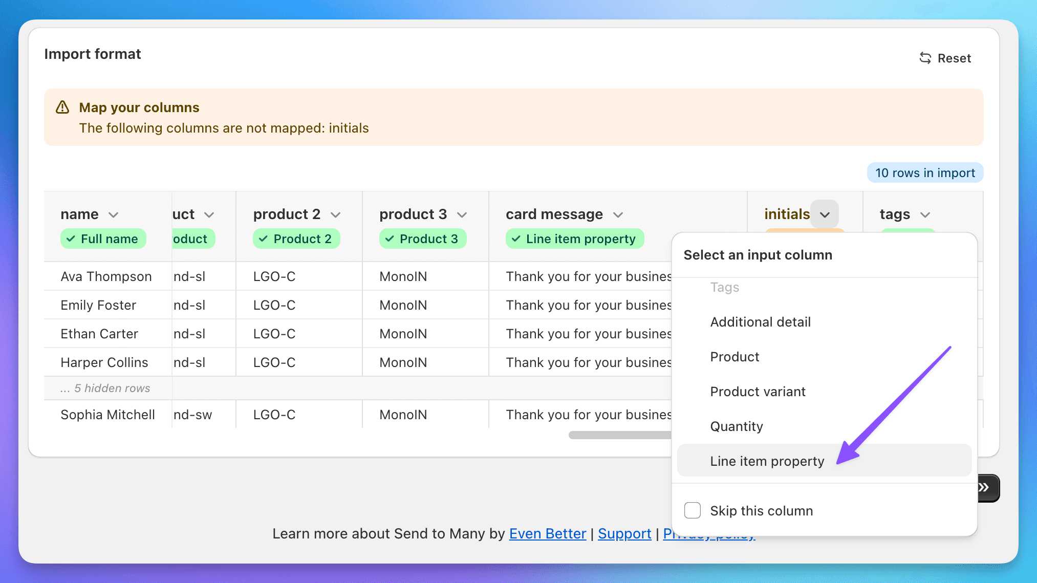When mapping import columns on Step 1 of a Send, assign one or more columns to the "Line Item Property"