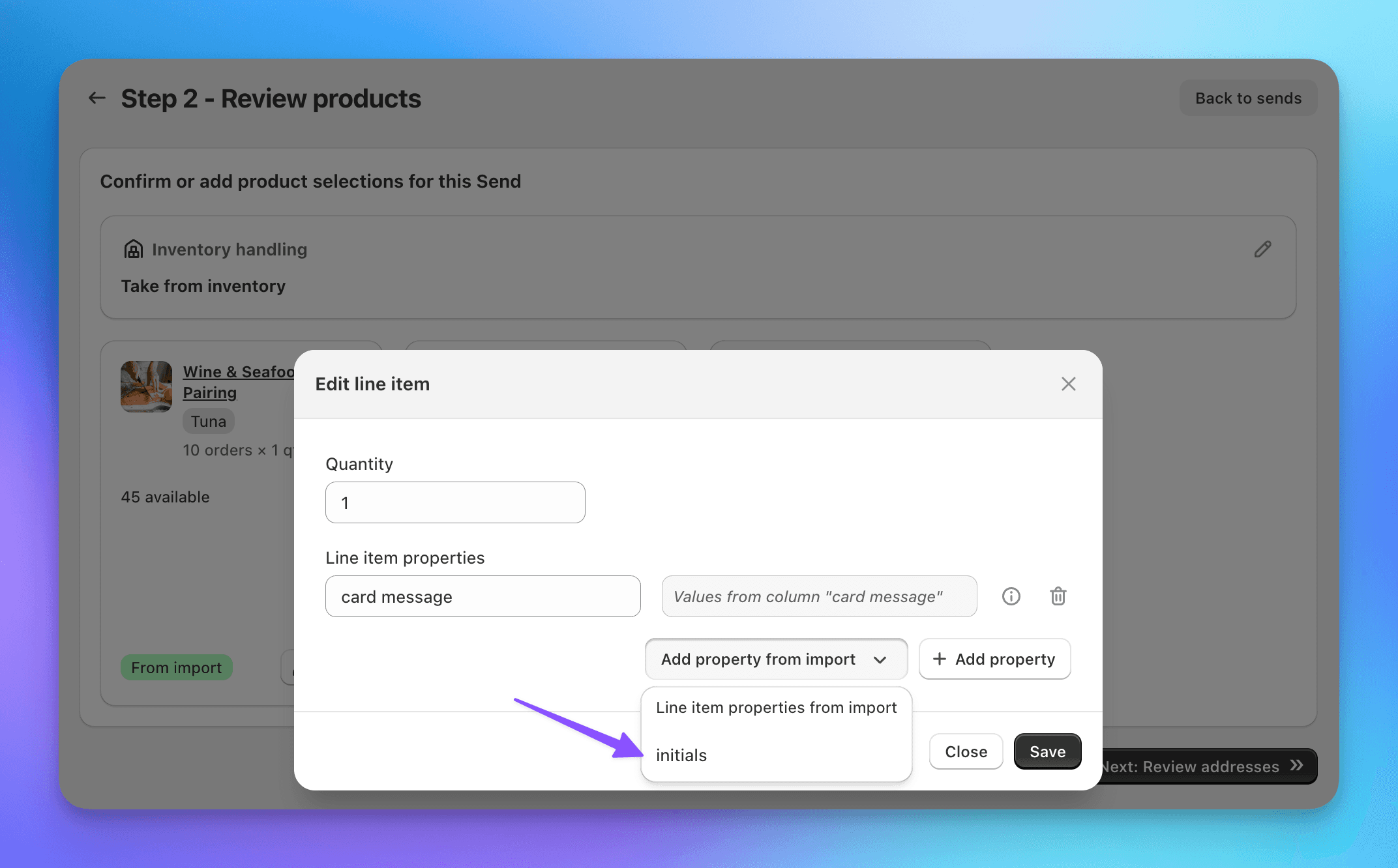 when reviewing customization products on Step 2 of the Send, assign the line item property to the desired product
