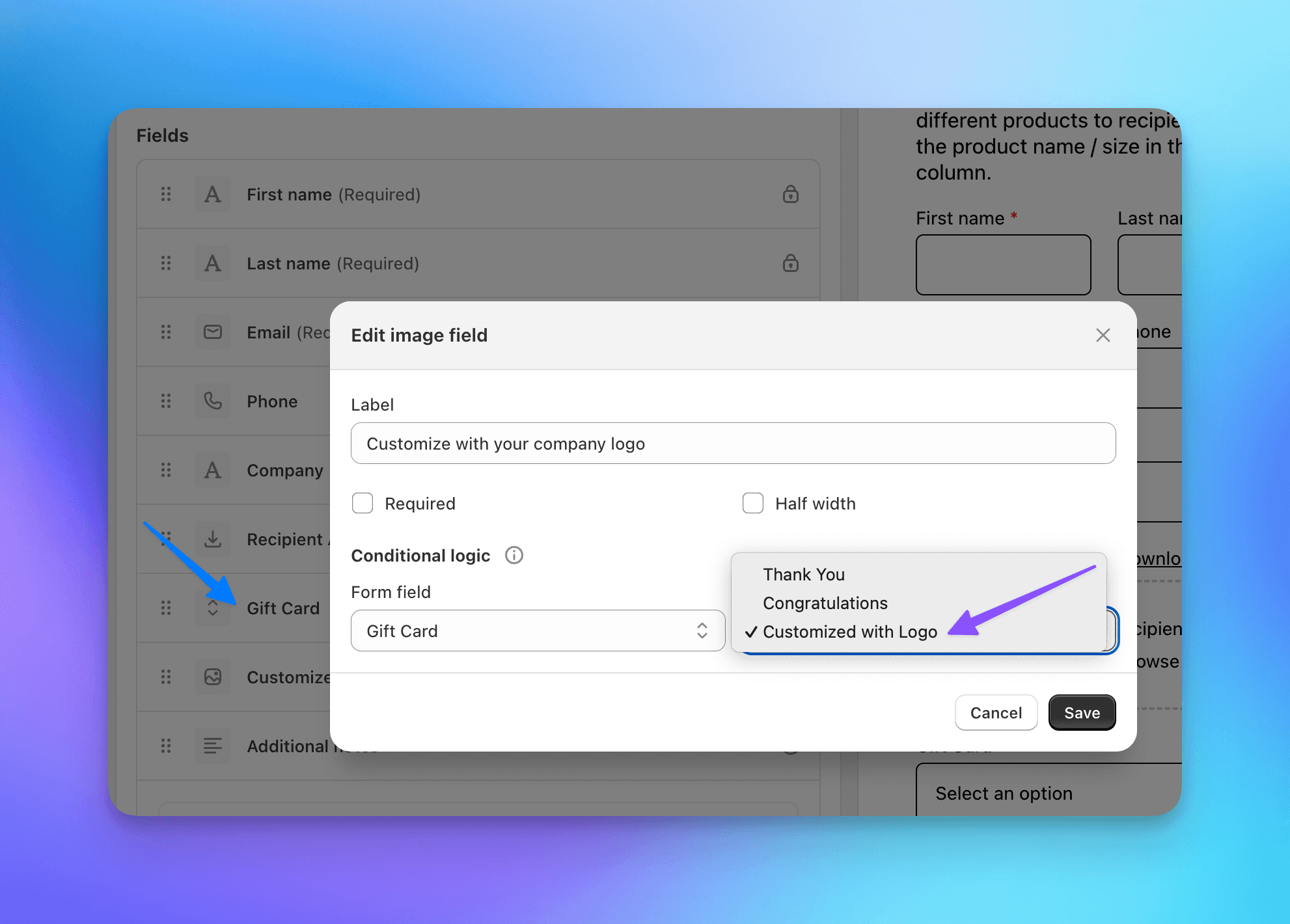 Fields in the inquiry form can be set to show only under certain conditions. For instance, you can set up a logo upload field that only displays when a user selects the logo option in another field. The controlling field needs to be above the field being controlled in the sort order. And it needs to be a dropdown, checkbox, or radio button field.