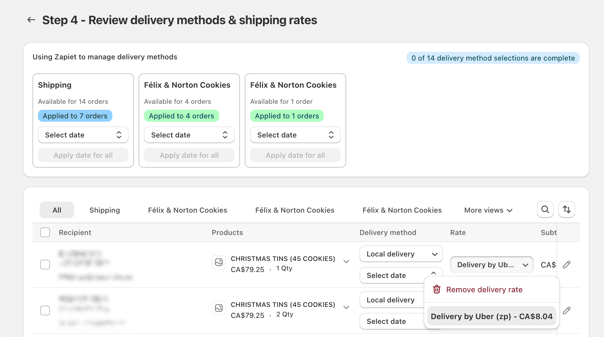 Manual sends now support local delivery rates via Zapiet or Bird integrations. Similar to how local delivery works in multi-recipient checkout, you can choose Shipping or Local delivery per recipient (or apply the choice in batches). When available, you can also set delivery date and time per recipient.