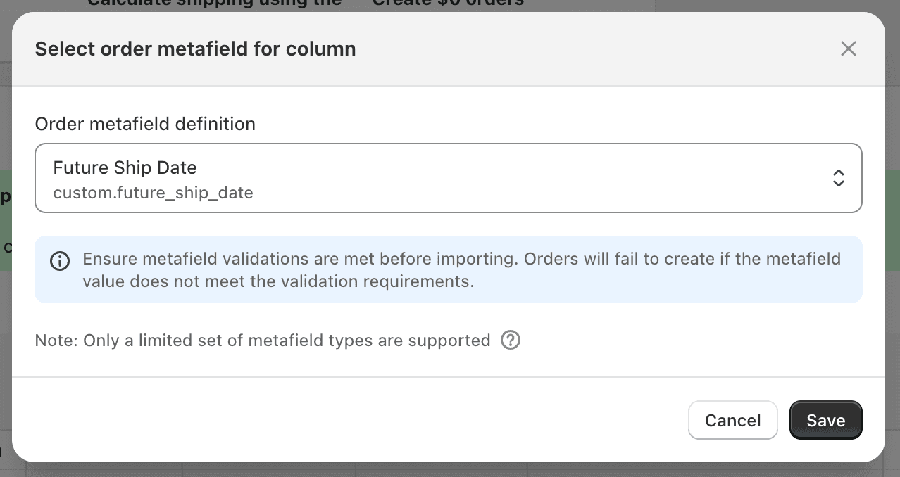 In the spreadsheet uploader, you can now select an order metafield as the destination for a column—useful when you want import data to land in structured Shopify metafields rather than notes or line item properties.