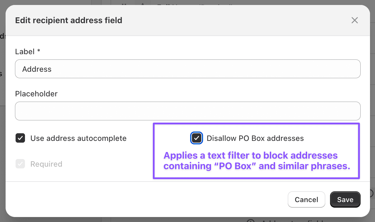 These validations run automatically anywhere the checkout block collects recipient contact information—no settings required.Added an option to disallow PO Boxes for recipient addresses.