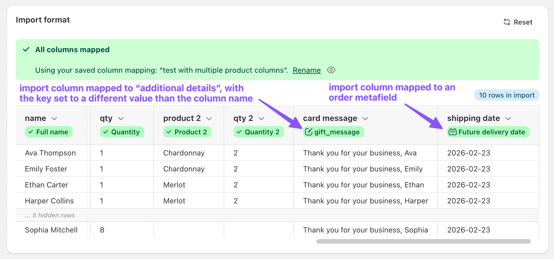 Note: Make sure the imported column’s format/content matches any Shopify metafield validation rules.Rename the import column ‘key’ when mapping to an order ‘additional details’ field.