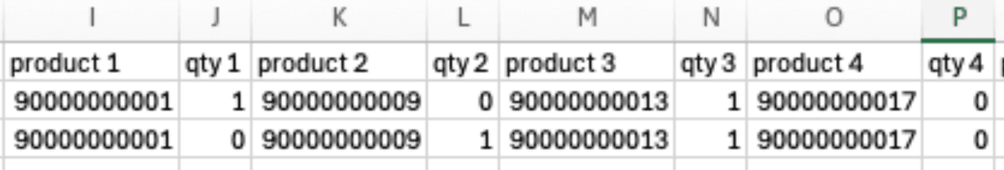 We now support "order form" style product columns on import. Add as many product and qty column pairs as you like, with SKUs pre-filled for each column in your sheet. Then indicate quantities for which products should go to each recipient or "0" where the product shouldn't be sent to that recipient.