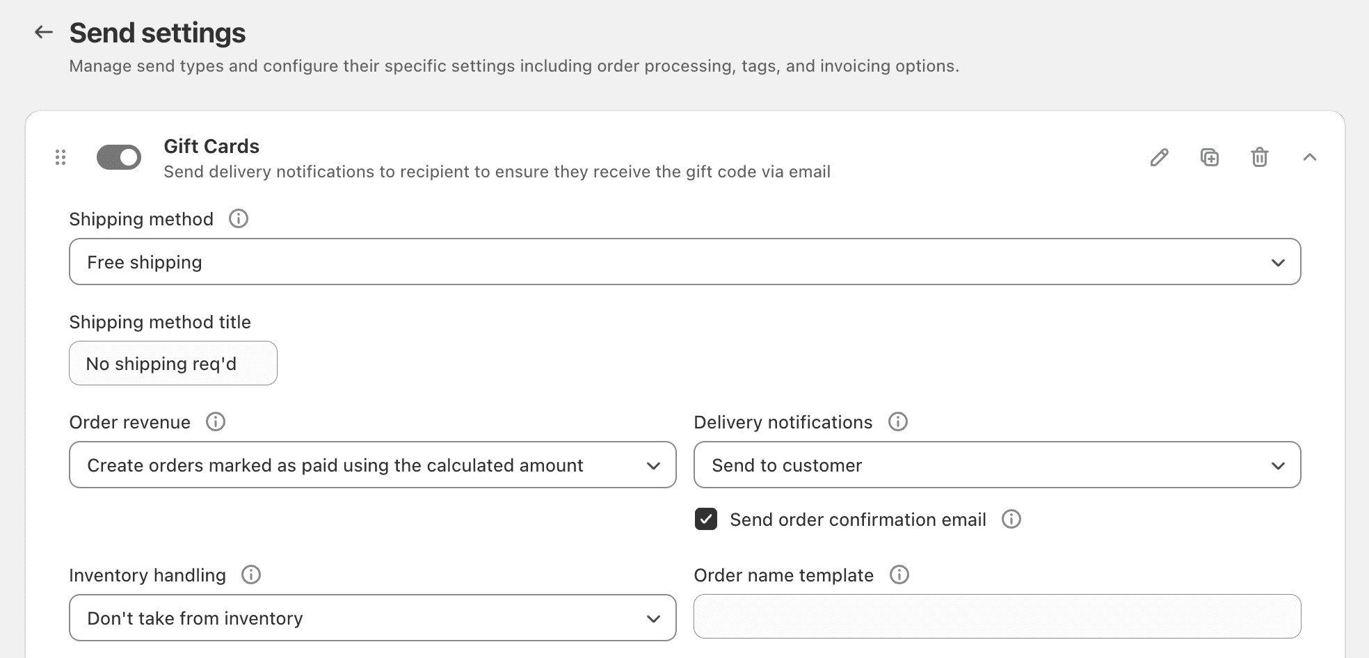 A recipient name and email address will be required to generate the gift cards. We suggest using Send Type settings similar to these to ensure the gift card with it's code is emailed to the recipient: